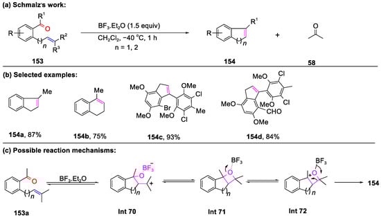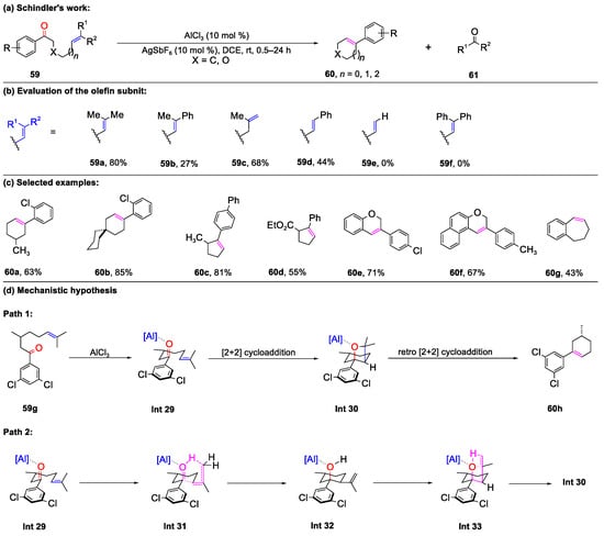 Shortly thereafter, Schindler and co-workers disclosed a highly efficient methodology for constructing five-, six-, and seven-membered rings via an aluminum (III)-ion pair-promoted carbonyl–olefin ring-closing metathesis reaction (Scheme 12) [66]. In-depth investigations revealed several key findings: (1) the heterobimetallic ion pairs [AlCl2]+[SbF6]–, formed by AlCl3 and AgSbF6, served as the critical active catalytic species; (2) the unexpected such as benzaldehyde and acetophenone hindered the reaction’s progress; (3) aryl ketones (59) containing an oxygen atom in the carbon chain or a β-hydrogen atom were well tolerated (60b, 60e, and 60f); (4) a previously inaccessible seven-membered ring (60g) was prepared by this method; and (5) no products stemming from trapped carbocation intermediates were detected through isolation or high-resolution mass spectrometry. Finally, DFT calculations suggested two plausible pathways for the formation of 60h, involving either a Lewis acid–base complex-mediated cyclization followed by a retro-[2+2] cycloaddition or an intramolecular addition of a terminal alkene via an oxetane intermediate.