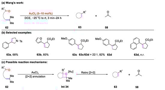 In the same year, Wang’s group realized the AuCl3-catalyzed intramolecular ring-closing carbonyl–olefin metathesis of 62, featuring a pendant isoprenyl group, to produce N-heterocycle (63a) and cyclopentene (63b, 63c) in good to excellent yields (Scheme 13) [67]. This transformation was compatible with diverse benzene ring backbones containing electron-donating or electron-withdrawing groups, a furan ring, and a β-naphthalene ring at R1. However, switching β-naphthalene with an α-naphthalene ring could not give the corresponding cyclopentene derivative 63d. Notably, the isomer 63d is generated using 4-methoxyphenyl-substituted β-ketoester as a substrate, which is more selective compared to the approach mediated by FeCl3 or Host-HCl [54,68]. Density functional theory (DFT) calculations suggested a [2+2] cycloreversion mechanism of fused oxetane Int 34, leading to the desired product 63.