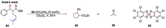 Subsequently, Greb’s group employed β-ketoester 64 as a substrate for directly access to cyclopentene 66, promoted by 65-(CH3CN)2 at room temperature in a highly efficient manner, which indicated that the formation of an acetone by-product did not hinder catalytic activity (Scheme 14) [69]. Remarkably, this transformation could not proceed with replacing 65-(CH3CN)2 with 65-(acetone)2, which emphasized the critical role of the displacement of the first Lewis base in a bis-adduct of 65.