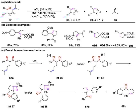 In 2023, structurally diverse cyclopentenes 68 and 69 were accessed via ring-closing carbonyl–olefin metathesis, catalyzed by 10 mol% InCl3 with the assistance of microwave irradiation (Scheme 15) [70]. Generally, 67 featuring a 1,3-diketone functional group delivered the preferential cyclization of electron-rich aromatic ketones (68a–68b). While the acetyl and benzoyl groups were contained in the substrate, 68c was formed in a 23% yield. Mechanistic studies revealed that the tandem [2+2] cycloaddition/cycloreversion process facilitated the construction of 68 and 69. Notably, the coordination of 67a with InCl3 could occur at the carbonyl group, leading to intermediates Int 35 and/or Int 36, simultaneously forming oxetanes Int 37 and Int 38. Consequently, this reaction provided a mixture of 67e and 69b.