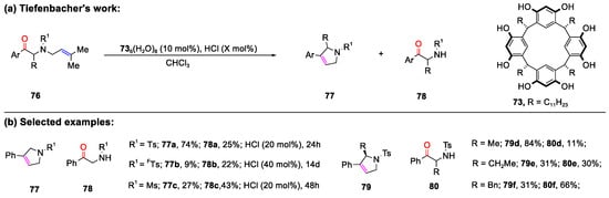 In 2022, the same group successfully demonstrated the efficient synthesis of several 3-aryl-2,5-dihydropyrroles (77), utilizing the combination of 736(H2O)8/HCl (Scheme 18) [76]. This catalytic system was found to be compatible with Lewis basic protecting groups. Additionally, the size of the substrates (76) significantly influenced the yield and selectivity of the reaction, which indicated that the carbonyl–olefin metathesis reaction took place inside the capsule exclusively, combined with the result of the control experiments. Intriguingly, the presence of 736(H2O)8/HCl triggered the deallylation of chiral amino acid derivatives.