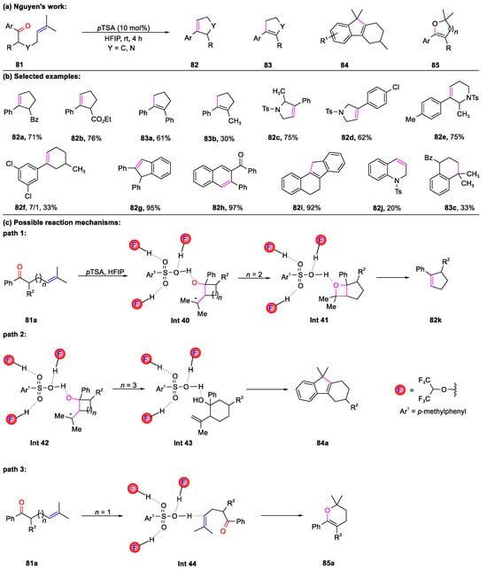 Inspired by these works, Nguyen, Koenigs, and colleagues demonstrated a hydrogen bonding-assisted Brønsted acid catalysis strategy using hexafluoroisopropanol (HFIP) solvent in conjunction with para-toluenesulfonic acid (p-TSA), which controlled the spatial arrangement of reactants and stabilized the transition state, enabling carbonyl–olefin metathesis reactions to yield a mixture of compound 82 and its isomerized alkene 83 (Scheme 19) [77]. This approach prepared a diverse range of cyclopentenes (82a and 82b), five-membered N-heterocycles (82c and 82d), indene (82g), naphthalene (82h), and six-membered cyclic derivatives (82e, 82f, and 82j), with good to excellent yields. Moreover, the study demonstrated the feasibility of 6-endo-trig, carbonyl-ene, and 5-exo-trig cyclization processes, affording desired products 84a and 85a in moderate yields. The theoretical analysis revealed the following: (1) HFIP played an important role in the formation of hydrogen bond networks; (2) the proton migration process resulted in Int 43, which delivered classic carbonyl-ene product 84a via a stepwise mechanism; (3) when n = 1 in 81a, the high ring strain of the putative 1-oxo-bicyclo-[2.2.0]-hexane intermediate could not be formed smoothly, while the 6-endo dig cyclization reaction giving pyrane 85a was a good choice; and (4) Int 44 without an activated carbonyl group underwent 6-endo-trig and 5-exo-trig cyclization, leading to the formation of 85a. While there was an aromatic substituent at the alpha position of 81a, cyclization in a Friedel–Crafts alkylation fashion worked smoothly, affording tetrahydronaphthalene 83c.