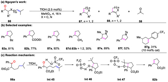 Very recently, a homogeneous Brønsted acid-catalyzed intramolecular ring-closing protocol employing nitromethane as a solvent was established by the same group (Scheme 20) [78]. It is worth noting that a negligible isomerization product was observed in this transformation. Diverse cyclopentenes (82a, 82b, 87a, and 87d) and five-membered heterocycle derivatives (87e and 87f) were successfully constructed. Compared with 82a and 87d, the substituent at the α-position of 86 has a significant impact on the yield of the isomerization. Further investigations revealed that protonated carbonyl species (Int 45) derived from triflic acid transformation underwent a stepwise mechanism involving two nucleophilic addition steps, leading to the formation of the oxetane intermediate Int 47 via an ion pair intermediate Int 46. This was followed by a retro-[2+2]-cycloaddition of Int 47, resulting in the cycloalkene product 82b.