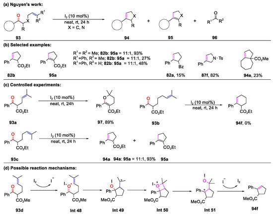 Later, carbonyl–olefin metathesis promoted by molecular iodine was unveiled by Nguyen and co-workers (Scheme 22) [80]. When non-nitrogen-containing substrate 93 underwent this transformation, a mixture of regioisomeric products (94 and 95) was observed due to trace Brønsted acids in the reaction mixture. Notably, the functional group at the α-position of the new C–C double bond have an influence on the ratio of 94 to 95. For example, for substrates containing Brønsted basic nitrogen centers or double substitution at the α-position of 93, isomerization would not occur (87f, 94e). Moreover, the conjugation between the aromatic ring and the carbonyl group is crucial for this transformation, which could explain the low yield of 94e. Increasing the loading to 25%, the corresponding product 94c could be obtained through the metathesis of 93, without using a substitution on the carbon between the carbonyl and the nitrogen centers as a substrate. With different carbon chain linkers between the carbonyl and the olefin moieties, the target compound changed vastly (Scheme 22c). Based on these controlled experiments, DFT calculations and kinetic studies, Nguyen’s group hypothesized that I+ ion produced by a very endergonic splitting of molecular iodine due to an unfavorable charge separation could have served as a Lewis acid to activate the carbonyl group providing Int 48, which triggered the formation of oxetane Int 50, followed by a rearrangement, generating 94f.
