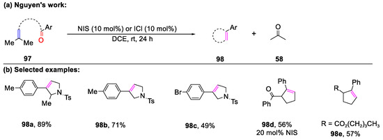 At the same time, a similar experiment where N-iodosuccimide (NIS) and iodine monochloride (ICl) were engaged as iodonium sources to promote the intramolecular carbonyl–olefin metathesis of 97 was achieved (Scheme 23) [81], further expanding the toolbox for these transformative reactions. Interestingly, the noticeable regioisomerization of the cyclized product 98 was not observed in this conversion. The control experiment validated that the iodonium catalytic pathway of molecular iodine promoted this process.