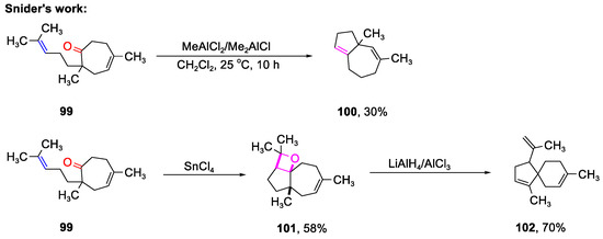 In 1984, a 30% yield of 7,8-dimethyl-1,2,4,5,6,8-hexahydroazulene 100 was achieved through the ring-closing process of 99, involving the loss of acetone, in the presence of a specific ratio of MeAlCl2 (2/3 eq) and Me2AlCl (1/3 eq) (Scheme 24) [82], which opened the door to the synthesis of bicyclic structures through a Lewis acid-catalyzed carbonyl–olefin metathesis reaction. Notably, when 99 was treated with SnCl4, LiAlH4, and AlCl3, a spirocyclic product, 102, was obtained instead [83], highlighting the significant influence of the chosen Lewis acid on product formation.