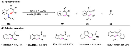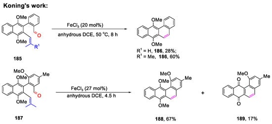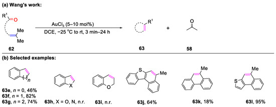 Inspired by Snider’s work, various bicyclic frameworks were provided, mediated by FeCl3 and AlCl3 (56, 57, and 69). In 2020, Wang and co-workers described an efficient way to construct bicyclic aromatic skeletons catalyzed by AuCl3 (Scheme 25) [67]. Moreover, 1H-indene 63e, 1,2-dihydronaphthalene 63f, and 6,7-dihydro-5H-benzo [7] annulene 63g were prepared through this process. Unfortunately, indole 63h, benzofuran 63h, and 2H-chromene 63i could not be obtained through carbon–oxygen and carbon–nitrogen bond cleavages promoted by AuCl3. Importantly, polycycle derivatives (63j–63l) were delivered in good yields.