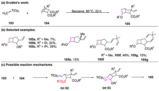 Moreover, it was realized that ester-substituted norbornenes (104), in conjunction with Titanamethylene complex 103, served as substrates to synthesize bicyclo[3.2.0]heptene ring 105 via cyclobutane intermediate Int 52 (Scheme 26) [46]. Enhancing the steric bulk of the ester group not only fortified steric protection around the carbonyl, limiting methylene transfer, but also intensified vicinal steric interactions between the ester groups, promoting the norbornene metathesis process (105a–105c). Additionally, the carbonyl–olefin metathesis of unsymmetrical norbornene substrates facilitated the production of desired products (105e–105g) in moderate yields, without a competing reaction between the norbornene double bond and endo-ester. Moreover, the construction of OPQ, UVW, and JKL ring systems found in maitotoxin was achieved through the carbonyl–olefin metathesis reactions of 106, 109, and 111, followed by a reduction in the resulting carbon–carbon double bonds catalyzed by Tebbe reagent 107 or Petasis reagent 112 (Scheme 27) [84].