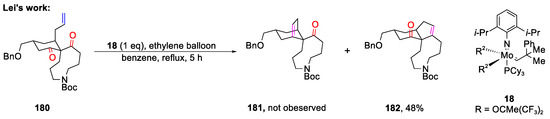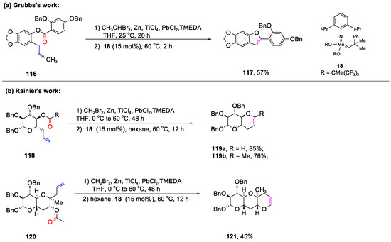 Drawing inspiration from Clark’s work [87,88], Grubbs and Rainier’s teams devised a method for synthesizing benzofuran derivative 117 and cyclic enol ethers (119 and 121) (Scheme 29) [89,90]. This method involved the use of stoichiometric titanium reagents to convert esters into acyclic olefinic enol ethers, which were subsequently transformed into the desired products through catalytic ring-closing olefin metathesis utilizing molybdenum alkylidene complex 18.
