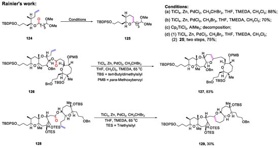 - Majumder, U.; Rainier, J.D. Olefinic-ester cyclizations using Takai-Utimoto reduced titanium alkylidenes. Tetrahedron Lett. 2005, 46, 7209–7211. [Google Scholar] [CrossRef]