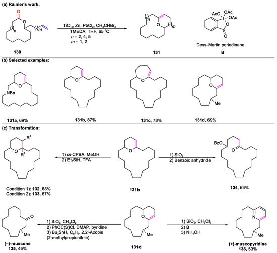 In 2007, Rainier’s team elaborated on the exceptional and unprecedented reactivity demonstrated by an in situ-produced reduced titanium ethylidene reagent, which was found to interact with carbonyl functional groups in a unique manner (Scheme 2) [50]. This interaction led to the formation of cyclic enol ether 22 via a ring-closing metathesis reaction, marking a significant advancement in the field. This approach efficiently pro-vided the desired products 22a–22d in moderate yields through a two-step metathesis sequence. Additionally, the gambieric acid A derivative 22e was achieved with a 50% yield via this transformation (Scheme 2c). Specifically, when using dibromomethane as the alkylidene source, the resulting titanium methylidene reagent exclusively produced acyclic enol ether 23.