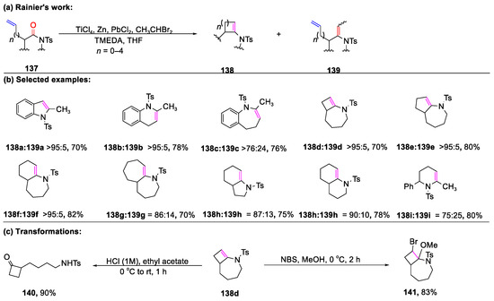 Bennasar’s group explored an innovative two-step procedure that involved the titanium-mediated methylation of N-acylamides (114), followed by ruthenium-catalyzed ring-closing metathesis (RCM) to give enamide 115 (Scheme 28) [85,86]. This protocol efficiently facilitated the synthesis of various benzo-fused five- and six-membered cyclic enamides (115a–115f) (including indole, 1,4-dihydroquinoline, and 1,2-dihydroisoquinoline) from an amide derived from ortho-alkenyl aniline or benzylamine. While there was potential for an extension to higher homologues, this process was constrained by the interference of alkene isomerization during the sluggish RCM step. Notably, direct annulation was observed in the titanium-mediated step, particularly with certain substrates, such as styrene derivatives, likely occurring through an olefin metathesis–intramolecular olefination tandem mechanism.