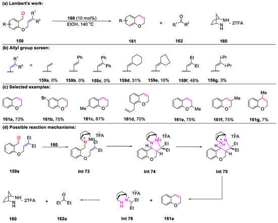 - Zhang, Y.F.; Jermaks, J.; MacMillan, S.N.; Lambert, T.S. Synthesis of 2H-Chromenes via Hydrazine-Catalyzed Ring-Closing Carbonyl-Olefin Metathesis. ACS Catal. 2019, 9, 9259–9264. [Google Scholar] [CrossRef]