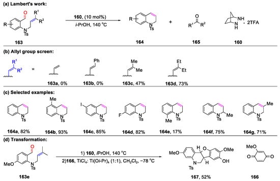 - Zhang, Y.; Sim, J.H.; MacMillan, S.N.; Lambert, T.H. Synthesis of 1,2-Dihydroquinolines via Hydrazine-Catalyzed Ring Closing Carbonyl-Olefin Metathesis. Org. Lett. 2020, 22, 6026–6030. [Google Scholar] [CrossRef]