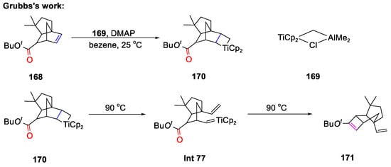- Stille, J.R.; Grubbs, R.H. Synthesis of (±)-Δ(9,12)-Capnellene Using Titanium reagents. J. Am. Chem. Soc. 1986, 108, 855–856. [Google Scholar] [CrossRef]