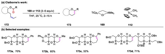 - Nicolaou, K.C.; Postema, M.H.D.; Claiborne, C.F. Olefin Metathesis in Cyclic Ether Formation. Direct Conversion of Olefinic Esters to Cyclic Enol Ethers with Tebbe-type Reagents. J. Am. Chem. Soc. 1996, 118, 1565–1566. [Google Scholar] [CrossRef]
