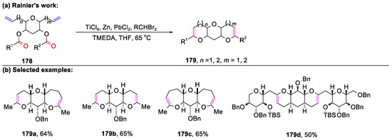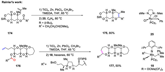 - Zhang, Y.; Rainier, J.D. Two-Directional Olefinic-Ester Ring Closing Metathesis using Reduced Ti Alkylidenes. A Rapid Entry into Polycyclic Ether Skeletons. Org. Lett. 2009, 11, 237–239. [Google Scholar] [CrossRef]