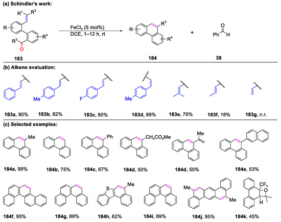 - McAtee, C.C.; Riehl, P.S.; Schindler, C.S. Polycyclic Aromatic Hydrocarbons via Iron(III)-Catalyzed Carbonyl-Olefin Metathesis. J. Am. Chem. Soc. 2017, 139, 2960–2963. [Google Scholar] [CrossRef]
