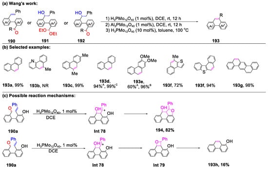 - Chen, Y.; Liu, D.; Wang, R.; Xu, L.; Tan, J.Y.; Shu, M.; Tian, L.F.; Jin, Y.; Zhang, X.K.; Lin, Z.H. Brønsted Acid-Catalyzed Carbonyl-Olefin Metathesis: Synthesis of Phenanthrenes via Phosphomolybdic Acid as a Catalyst. J. Org. Chem. 2022, 87, 351–362. [Google Scholar] [CrossRef]