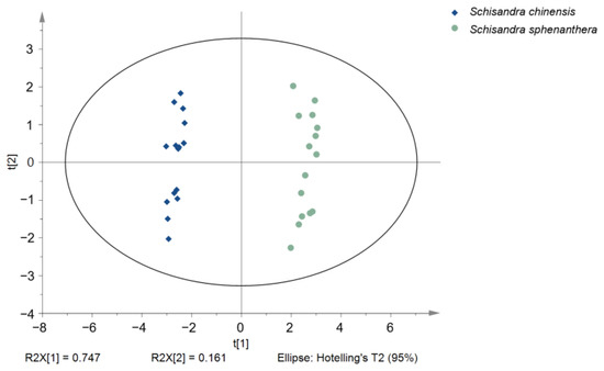 PCA is a mathematical statistical tool for categorizing relatively homogeneous groups in an unsupervised manner [13]. UPLC-MS data and GC-MS data from 15 batches of S. chinensis and 15 batches of S. sphenanthera were fused via low-level fusion into a large dataset, resulting in a 30 × 21 matrix. As shown in the score plot (Figure 1), 30 samples of S. chinensis and S. sphenanthera were separated into two groups along the t[1] axis, with S. chinensis on the left and S. sphenanthera on the right, indicating significant chemical differences between them. The first principal component contributed 74.7%, and the second principal component contributed 16.1%, with a cumulative explanation rate of 90.7% for the two principal components.