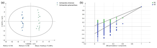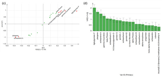 OPLS-DA analysis of S. chinensis and S. sphenanthera. (a) Score plot; (b) loading plot; (c) VIP diagram; and (d) permutation test diagram.