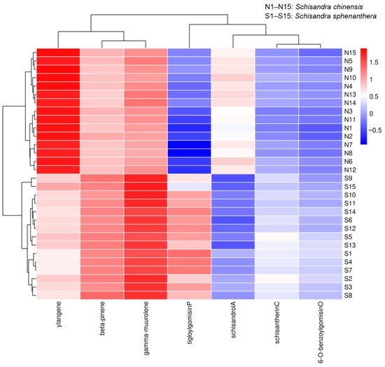 As depicted in Figure 3, the non-volatile component schisandrol A and the volatile component ylangene had higher contents in S. chinensis. Meanwhile, the non-volatile components schisantherin C, tigloygomisin P, and 6-O-benzoylgomisin O and the volatile components β-pinene and γ-muurolene had higher contents in S. sphenanthera.