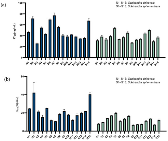 The IC50 values for DPPH· scavenging by the ethanol extracts of 15 batches of S. chinensis and 15 batches of S. sphenanthera are shown in Figure 4a. The IC50 of the S. chinensis extract was 49.67 ± 15.63 μg/mL, while that of the S. sphenanthera extract was 37.94 ± 7.57 μg/mL. Overall, both the S. sphenanthera and S. chinensis extracts demonstrated comparable DPPH·-scavenging abilities, with no statistically significant differences observed between the two.