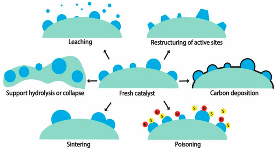 A catalyst’s stability over an extended duration is highly relevant in an industrial setting. One of the recommended metrics of stability for industry—catalyst consumption (kg-cat per tons-product)—[18] has an ideal value for catalyst consumption of less than 0.1, which implies in this case, that for 1 g of catalyst, 10 kg (or about 5 kilomoles) of H2 has to be produced. The hydrothermal condition that a catalyst is subjected to in APR poses high stress on its stability [19]. Mechanisms for catalyst deactivation during a hydrothermal reaction are summarized in Figure 1. With the exception of poisoning, most of them are of relevance to APR. For a detailed discussion on these deactivation mechanisms, the reader is referred to authoritative reviews in the literature [20,21,22] and the references cited therein.