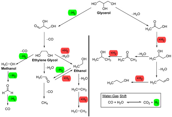 Reaction pathways for the aqueous-phase reforming of glycerol, ethylene glycol, ethanol, and methanol. On the left side of the image are reactions that produce and consume H2, while on the right side are reactions that only consume H2, except for the water–gas shift reaction which produces H2 from CO and water. Green: H2 produced from reaction. Red: H2 consumed in reaction.