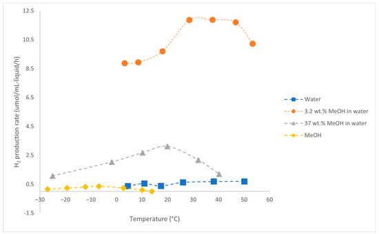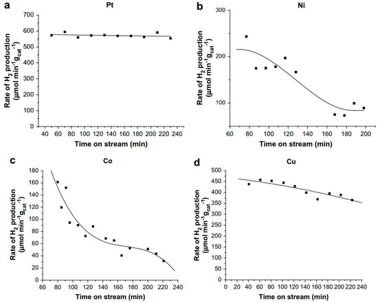 Hydrogen production rate of Pt/HUSY in the APR of 10 wt.% glycerol in water at 230 °C, 32 bar, LHSV of 8 h−1. Data extracted from the work of Wen et al. [42] with WebPlotDigitizer [58].