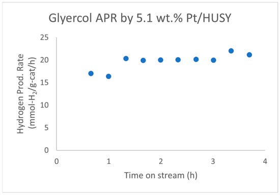 Wen et al. reported that a 5.1 wt.% Pt/HUSY (SiO2/Al2O3 = 4.8) catalyst showed no observable deactivation in the aqueous-phase reforming (APR) of glycerol for about 4 h on stream (Figure 5) [42]. The average hydrogen production rate over this 4 h period is 19.7 ± 1.7 mmol-H2/g-cat/h. Additionally, Pt/HUSY maintained a higher metal surface area of 13.3 m2/g for the spent catalyst compared to 0.4 m2/g for Pt/SiO2 and 7.2 m2/g for Pt/Al2O3 after glycerol APR.