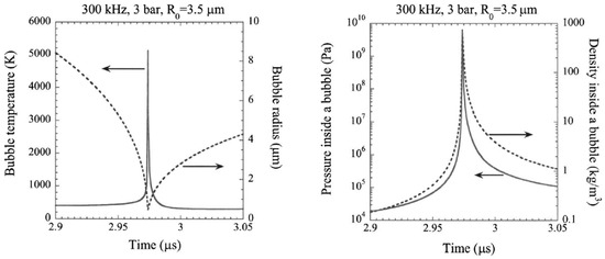 - Yasui, K.; Tuziuti, T.; Kozuka, T.; Towata, A.; Iida, Y. Relationship between the bubble temperature and main oxidant created inside an air bubble under ultrasound. J. Chem. Phys. 2007, 127, 154502. [Google Scholar] [CrossRef] [PubMed]