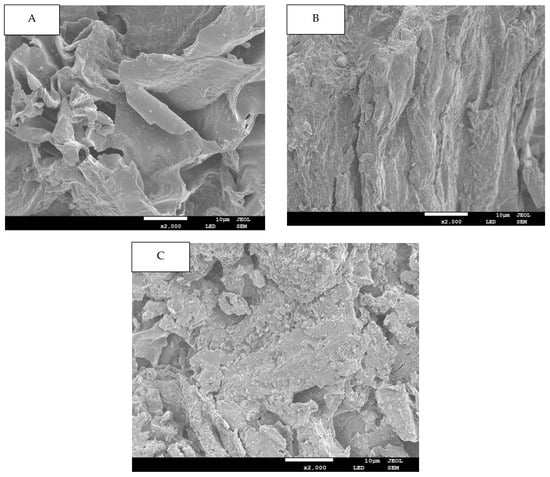 In this study, the microstructural attributes of all DFs fractions were elucidated by SEM and are demonstrated in Figure 1 for of G-AC (A), G-AL (B) and G-EN (C). In the case of the G-AC samples, the DF’s surface exhibited prominent surface irregularity, enhanced pore loosening, cell-wall disintegration, as well as microstructural impairment as compared to the surface of the DF extracted by G-EN and G-AL. The DFs extracted by the enzymatic method had more complicated structures, in conjunction with loosened pores and surface roughness, while the G-AL showed a relatively flat structure. This could possibly be ascribed to the fact that sodium hydroxide (NaOH) caused potent oxidation during the extraction process. The high degree of structural impairment in the case of acidic fractions could be due to the loosening and disintegration of the DF’s sheet-like structure. It was also evident from the SEM micrographs that the acidic method significantly affected the ginseng residue-derived DF structure. Furthermore, DFs with looser spatial structures and less degree of compactness exhibited an enhanced surface area and may exert a significant effect on their adsorption capacities, such as oil and water retention, bile acid, nitrite ion, and glucose absorption capacities. Conclusively, it could be inferred that the extraction method type may cause significant alterations in the properties of DFs extracted from ginseng residue.