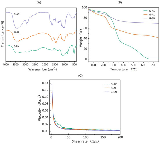 FT-IR spectra (A), thermal properties (B), and rheogram plot (C) for G-AC, G-AL, and G-EN.