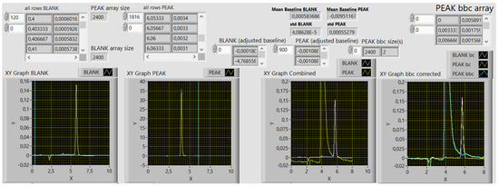 The front panel of the first virtual instrument with the results of raw data treatment. The first three XY graphs, from left to right, present raw input data, namely, a BLANK trace, a PEAK trace, and both in a combined view. The rightmost panel presents the baseline-corrected (bc) BLANK and PEAK traces and the baseline- and blank corrected (bbc) PEAK trace in light blue. The PEAK bbc array data (top right), related to the graph below, are exported as a text file. The values are raw, calculated, and the digits do not present the significant figures. Decimal sign is comma.