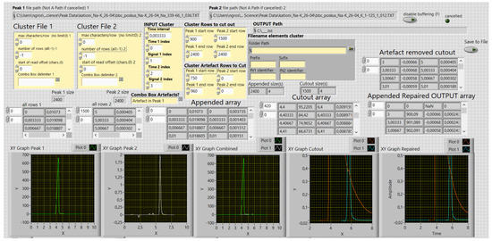 Figure 4 presents the front panel of the 2nd VI. The first three XY graphs, from left to right, present the imported data, in this case, bbc corrected PEAK 1 and PEAK 2 traces. The next graph presents the data cutouts relevant to the peak-overlapping study. In the range of the blue trace, there is an artefact on the declining side of the red trace; the rightmost graph shows that it was corrected for. This graph pertains to the appended repaired OUTPUT array above it, comprising data that are exported as a text file. The acquisition times of the traces were compared, if mismatched, combined, and missing peak response values interpolated. As a result, they both obtain a common timeline. The first column of the array comprises times and the next, relative times. The peak responses follow in the consecutive columns.