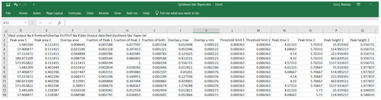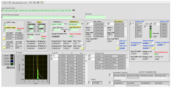 Figure 5 presents the front panel of the 3rd VI. The appended repaired two peak data with a common timeline are the input. In the XY graph is the final representation with the overlapping area marked in green. During the process, the graph changes, starting with the presentation of the input data. The indicators marked with white or yellow rectangles show the peak-evaluation or peak-overlapping-evaluation results. File export is optional, since one might test several different methods for threshold limit determination. We explain the output parameters in the following section, each line of the fourth VI’s MS Excel file in Figure 6 was extracted from the third VI’s output.