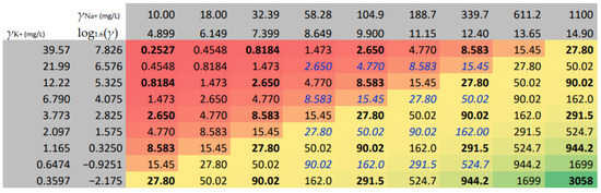 Mass concentrations of sodium and potassium and their corresponding 1.6-base logarithmic values as a foundation of the equidistant design of experiment 1 and design of experiment 2 factorial designs. The values in the coloured area are the sodium and potassium mass concentration ratios. The figures in bold correspond to the combinations of the factorial levels of the five-level design of experiment 1. The enframed, italicised figures in blue define a four-level design of experiment 2. The red–yellow–green colour gradient helps recognise similar values.