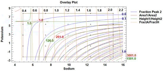 Four output variables were evaluated with DoE 1, namely, Fraction Peak 2, Area1/Area2, Height1/Height2, and FractA/FractH. The first variable corresponds to the VI fraction of Peak 2. Index 2 pertains to potassium ion. The second and the third output variables are the quotients of Peak area 1 over Peak area 2 and, similarly, Peak height 1 over Peak height 2. The variable FractA/FractH is, by being a quotient of the previous two, an approximation of the relative change in the peak width of sodium ion over the peak width of potassium ion.
