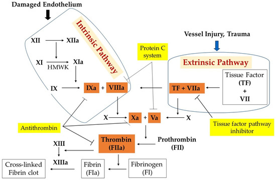The procoagulant/anticoagulant balance is maintained through the interaction between platelets and vascular endothelium, and with a predominance of the active form of anticoagulant forces. Coagulation activation is tightly regulated by several endogenous anticoagulants, which provide a counter mechanism to clot formation. Tissue factor pathway inhibitors (TFPI) and thrombomodulin are endothelial-associated anticoagulant proteins, while protein C, protein S, and antithrombin are circulating anticoagulant proteins. The TFPI pathway inhibits early phases of the procoagulant response [46], whereas activated protein C in concert with its cofactor, protein S, degrade factors VIIIa and Va [47], the two proteins that play an important role in the final step of the coagulation pathway. The partial deficiencies of the circulating anticoagulant proteins are causes of VTE [48], indicating that the anticoagulation system is responsible for regulating hemostasis. The reader is referred to the following reviews for more detailed information [49,50,51,52] (Figure 1). Procoagulant/anticoagulant imbalance leads to the pathogenesis of stroke, ischemia, myocardial infarction, and particularly venous thromboembolism. Increasing levels of the active form of procoagulants due to reduced anticoagulants and perturbed vascular endothelium cause unchecked activation of coagulation. It has emerged that endothelial dysfunction and hemostatic derangement cause several pathophysiological disturbances of primary and secondary hemostasis, fibrinolysis, and subsequent tissue repair.