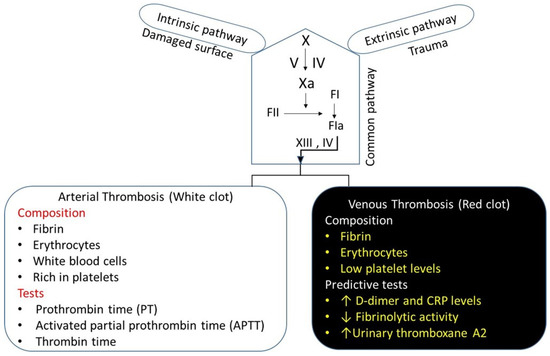There are two broad classifications of thrombosis: arterial thrombosis and venous thrombosis, which is a major focus of this review (Figure 3). Both arterial thrombosis and venous thrombosis are similar, but there is a subtle difference between the two. Arterial thrombosis is a platelet-predominant phenomenon. Histopathologic features that have been considered specific for arterial thrombosis include fibrin, leukocytes, and an abundance of platelets, providing a white appearance [53]. Patients with arterial thrombi are at high risk of acute stroke, myocardial infarction, or peripheral arterial disease. Venous thrombosis is generally understood as a disorder in plasma coagulation, and is associated with red blood cells and fibrin-rich, presenting a red appearance, i.e., as a “red clot” [54] (Figure 3). Venous thrombi occur in areas of reduced blood flow and stasis, leading to the accumulation of procoagulants and reduced levels of the local anticoagulant pathway [55]. The severe compression of the iliac vein in pregnant women [56] patients, May–Thurner syndrome (an iliac vein compression syndrome) [57], or the combination of the two, creates venous stasis that can contribute to the increased risk of VTE. On histopathology, venous clots are composed of fibrin, leukocytes, and red blood cells, and low levels of platelets compared to arterial thrombi. According to the dogma, platelets are not involved in the pathogenesis of venous thrombosis. However, recent evidence suggests that platelets play an important role in VTE pathophysiology [58], and may be involved in the initiation of DVT [59]. This suggests a need to consider the antiplatelet agents as antithrombotic therapy for the management of DVT and VTE.
