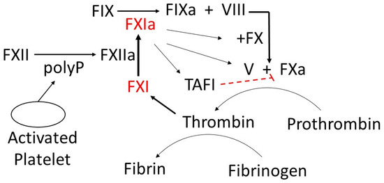 When the endothelium of a blood vessel is damaged, exposing the subendothelium to blood, both platelets and FXII are activated, promoting blood coagulation. Exposure of FXII to collagen leads to activation of FXII-mediated FXIa generation. Platelet-derived polyphosphate (polyP) can potentiate thrombin-feedback pathways through FXIa-mediated FIXa generation (Figure 5). Recent evidence indicates that FXIa contributes to clot formation by directly activating FX and FV [100]. The activation of FXI is also increased in the presence of thrombin [8], suggesting that thrombin circumvents the need for FXIIa to activate FXI. A positive feedback loop connected by the FXIa-mediated coagulation pathway promotes more fibrin formation (Figure 5). This positive feedback loop, which enhances thrombin generation, is relevant to the role of active FXI in promoting clot formation and maintaining clot stabilization. Active FXI also contributes to thrombosis through indirect activation of thrombin activatable fibrinolysis inhibitor (TAFI), which can contract fibrinolysis and pose a threat to the patient (Figure 5) [101]. An increase in FXIa-mediated activation leading to higher concentrations of active FIX, FX, thrombin [102], and TAFI can disrupt the normal equilibrium, resulting in an increased tendency to form venous thrombi. Thus, inhibition of FXIa is physiologically relevant in contexts where its concentration is elevated, such as at the site of clot formation, where thrombin is formed. Since a complete deficiency of FX in mice results in a lethal phenotype [103], inhibitors of FXIa can reduce the overconsumption of both FIX-dependent and FIX-independent FXa generation.