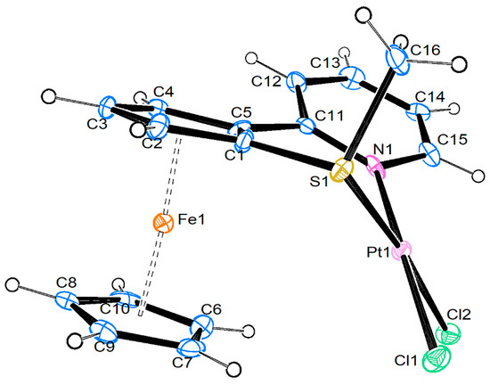 4.5. Synthesis of [Fe(C5H5){C5H3(SCH3)(C5H4N-2)-1,2}]-(κ-N,S)-PtCl2] (6)