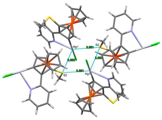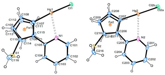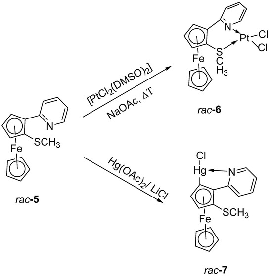 4.6. Synthesis of [Fe(C5H5){C5H2(HgCl)(SCH3)(C5H4N-2)-1,3,2}-(κ-C,N)] (7)