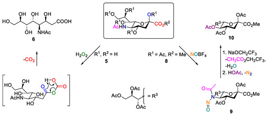 The preparation of 4-acetylamino-2,4-dideoxy-d-glycero- d-galacto-octonic acid (ADOA, 6) starting from N-acetylneuraminic acid (Neu5Ac, 5) as well as the synthesis of the peracetylated methyl ester of 3-deoxy-d-glycero-d-galacto-nonulosonic acid (10) starting from the peracetylated methyl ester of Neu5Ac (8) [20,21,22].