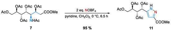 4.2.5. (1R,2S,3R)-1-(3-(Methoxycarbonyl)-1H-pyrazol-5-yl)butane-1,2,3,4-tetrayl tetraacetate (11)