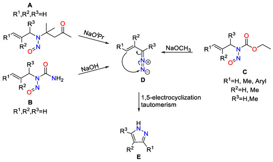 It is well known that the treatment of N-nitroso-allylaminoisobutyl methyl ketone (A), N-nitroso-N-allylurea (B) or N-nitroso-N-allyl carbamates (C) with base leads to intermediary vinyldiazoalkanes (D), which in turn rearrange to form pyrazoles (E) (Scheme 3) [23,24,25,26]. In general, 1,5-electrocyclizations of vinyl diazo compounds (D) have been described as a versatile means for the regiospecific preparation of pyrazoles [27,28,29,30].