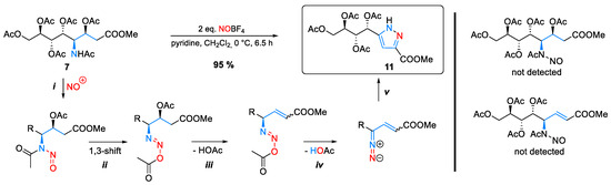 By treatment of the peracetylated methylester of 4-acetylamino-2,4-dideoxy-d-glycero-d-galacto-octonic acid (ADOA-PAE) with nitrosyl tetrafluoroborate, a serendipitous formation of a highly functionalized carbohydrate–pyrazole conjugate was observed in 95% yield. This observation is remarkable, as it involves a five-step one-pot synthesis that proceeds via an 1,3-acyl shift and a 1,5-electrocyclization, which usually requires thermal conditions; however, the reaction occurred at a temperature of 0 °C. Additionally, the excellent yield of the carbohydrate-decorated pyrazole and the regiospecificity of the cyclization are of particular interest, as regioselectivity is always a challenge in pyrazole synthesis. Subsequently, this novel access to pyrazoles starting from N-acetyl-allyl amides via nitrosation and electrocyclization was investigated. In addition, mechanistic studies for the formation of substituted pyrazoles of type were carried out.