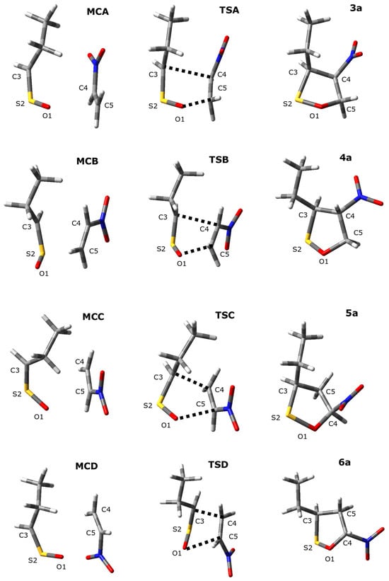 In the next step of our research, we explored the theoretically possible channels of 32CA. We started this analysis from the model reaction between oxide 1 and the parent nitroethene 2a. It was found that the energy profiles for all the considered paths of 1 + 2a cycloaddition in toluene solution were qualitatively similar. In particular, all the cases showed two critical points (a pre-reaction molecular complex, MC, and a transition state, TS), which were detected between the area of each individual reagent (from the first side) and the area of the respective product (from the second side). The conversion of the reaction system, at the first stage, led to the formation of MC complexes. The 1 + 2a→MC transformation was barrierless. During this process, the enthalpy of the reaction was reduced by a few kcal/mol (Table 1). At the same time, the entropy of the reaction always substantially decreased. As a consequence, the Gibbs free energy of the formation of MCs demonstrated a positive value. This fact excludes the possibility of the existence of these MCs as thermodynamically stable and isolable intermediates. Analyzing both MCs, it could be said that the substructures adopted a mutual orientation, which determined their further transformation into the respective transition states. Ultimately, the detected structures should be considered as “orientation complexes”. Next, important information enabled the analysis of key interatomic distances. It was found that the O1-S2 and S2-C3 bonds as well as the C4-C5 bonds were almost identical, as was the case with the individual reagents (Table 2, Figure 3). On the other hand, the distances C3-C4 and C5-O1 were beyond the range of the typical respective bonds in transition states [,,,]. Finally, at this stage, any transfer of the electron density between substructures was not observed (GEDT = 0.00 e). Thus, the described structures were not charge-transfer complexes. It should be underlined that similar types of intermediates were recently detected in the profiles of different types of cycloaddition processes [,,,].