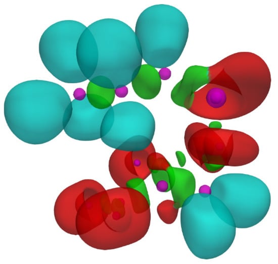 Topology of molecule 1 ELF, as rendered at an isovalue of 0.8. Core basins are given in magenta, protonated basins in cyan, disynaptic basins in green, and monosynaptic basins in red.
